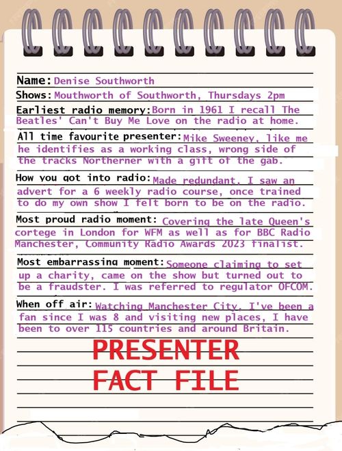 Denise has interviewed many many guests, from celebrities to ordinary people from our local community. Her shows celebrating a pop star who may have a birthday, anniversary, or sadly recently passed away, telling their story intertwined with their hits and lesser known tracks are ever popular with our listeners. Always well researched, her shows cover a variety of topics and issues or just let the music do the talking.